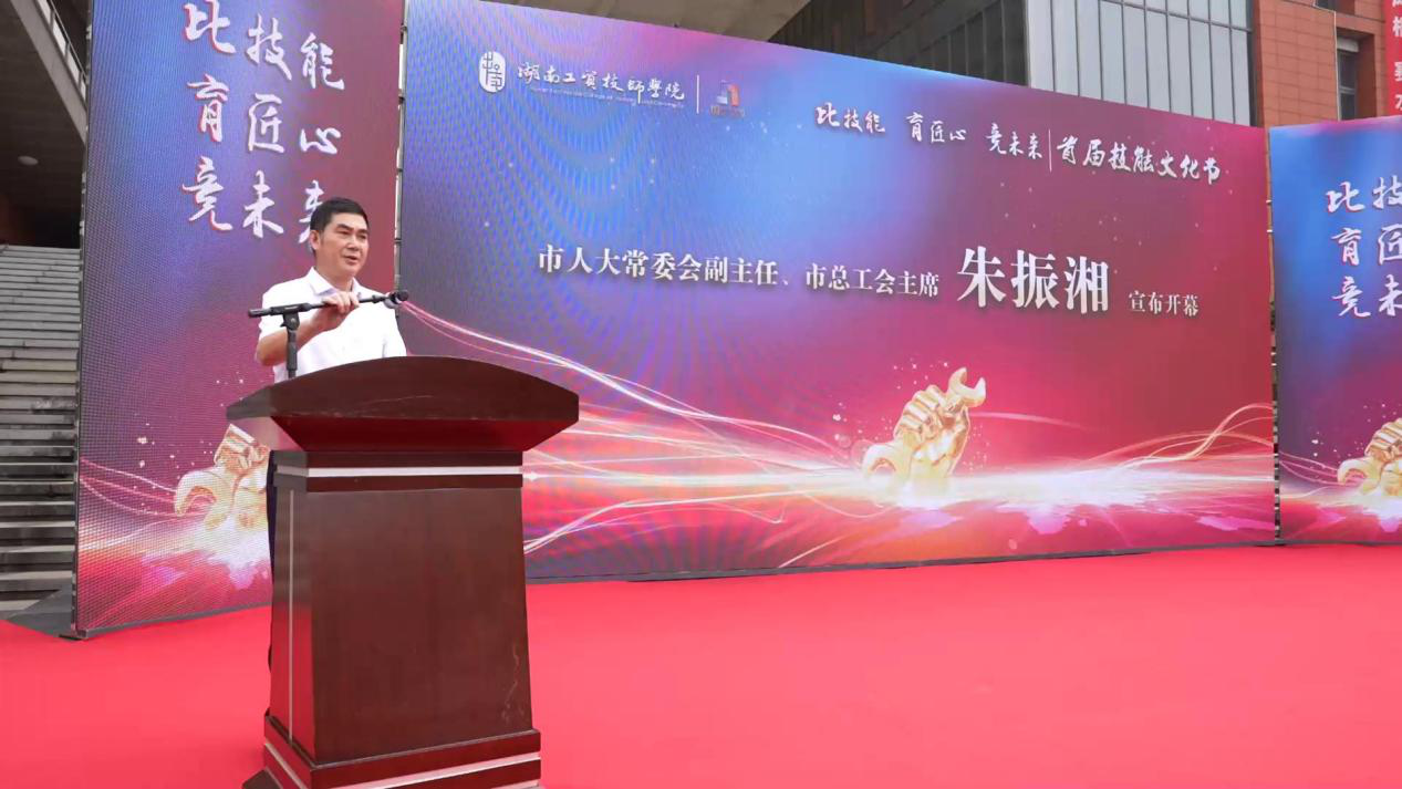 市人大常委会副主任、市总工会主席朱振湘宣布湖南工贸技师学院首届技能文化节开幕。