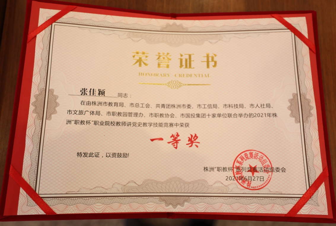 6月27日,在2021年株洲“职教杯”职业院校教师讲党史教学技能竞赛中,学院建筑装饰系教师张佳颖荣获一等奖,并被授予株洲市“五一劳动奖章”。