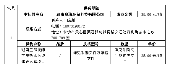 受湖南工贸技师学院的委托,湖南中卓工程项目管理有限公司代理机构对湖南工贸技师学院热水系统建设运营项目采购进行公开招标,经评标委员会评审,采购人确认,现将中标信息公告如下: