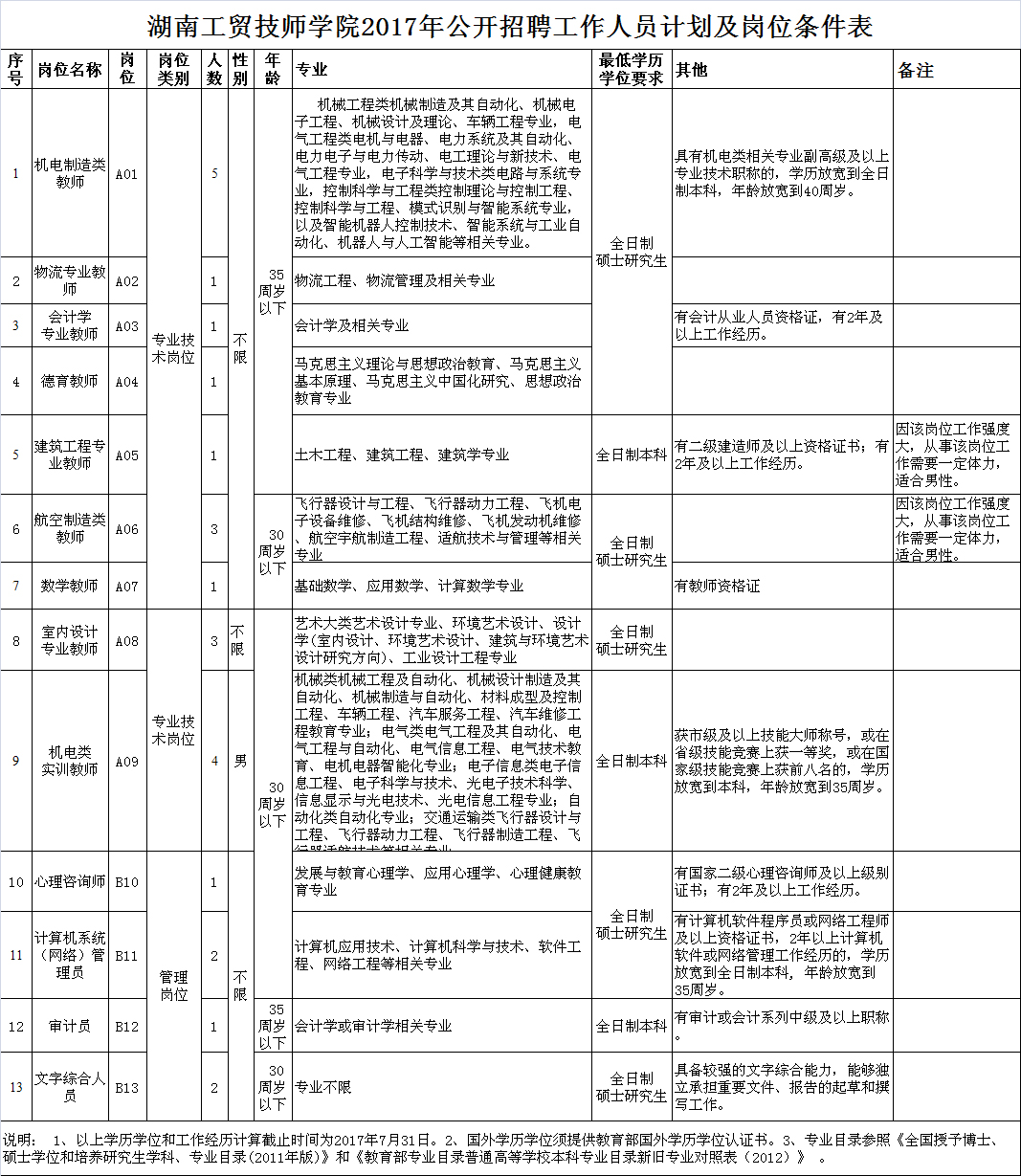 附件一:湖南工贸技师学院2017年公开招聘计划及岗位条件