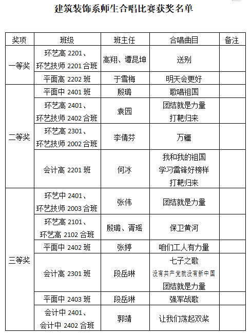 通过角逐,最终环艺高(技师)2201等2个班级获比赛一等奖,平面中2401班等4个班级获二等奖,会计高2301班等6个班级获三等奖。(建筑装饰系供稿)