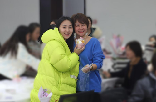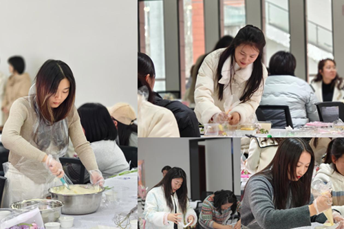此次活动,学院为广大女教职工送上一束鲜花,并邀请专业烘焙师教大家制作蛋糕,让大家在烘焙中度过一个温暖的节日。现场,女教职工们热情高涨,有的精心调配原料,有的专注裱花装饰,有的为作品贴上祝福贺卡,随着烤箱中飘出阵阵香甜,一份份精致的手工甜品逐渐成型,草莓、芒果、奥利奥等各种口味的蛋糕成为“颜值担当”。制作完成后,大家纷纷在主题背景墙前合影,记录下这温馨的瞬间。