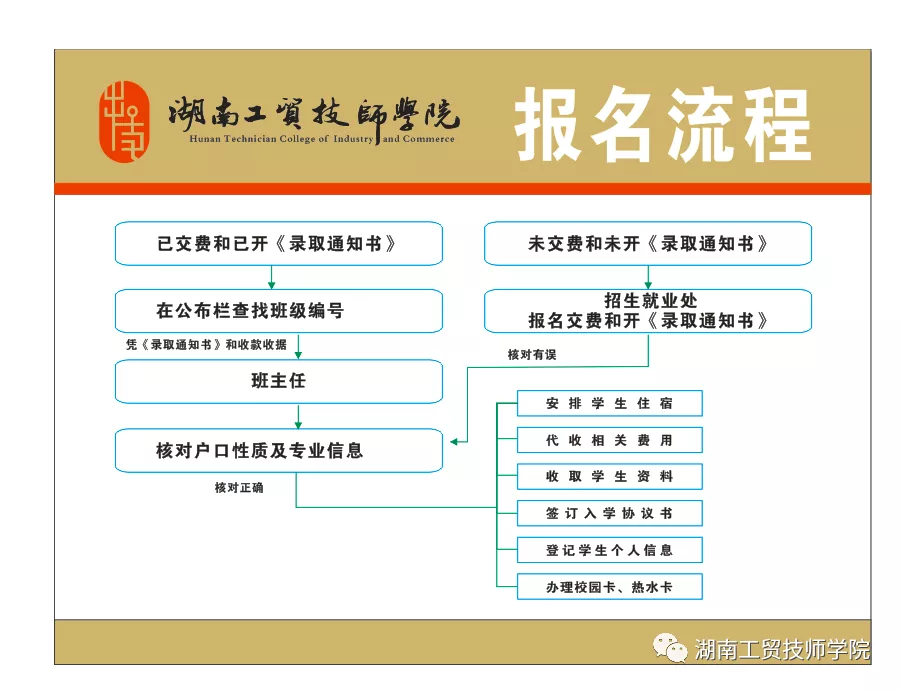 1、新生在“湖南工贸技师学院”官方微信号“新生报名”入口报名,报名成功后系统自动生成“报名回执单”,凭“报名回执单”到我院“新生报名处”刷卡缴费,并开具《录取通知书》。